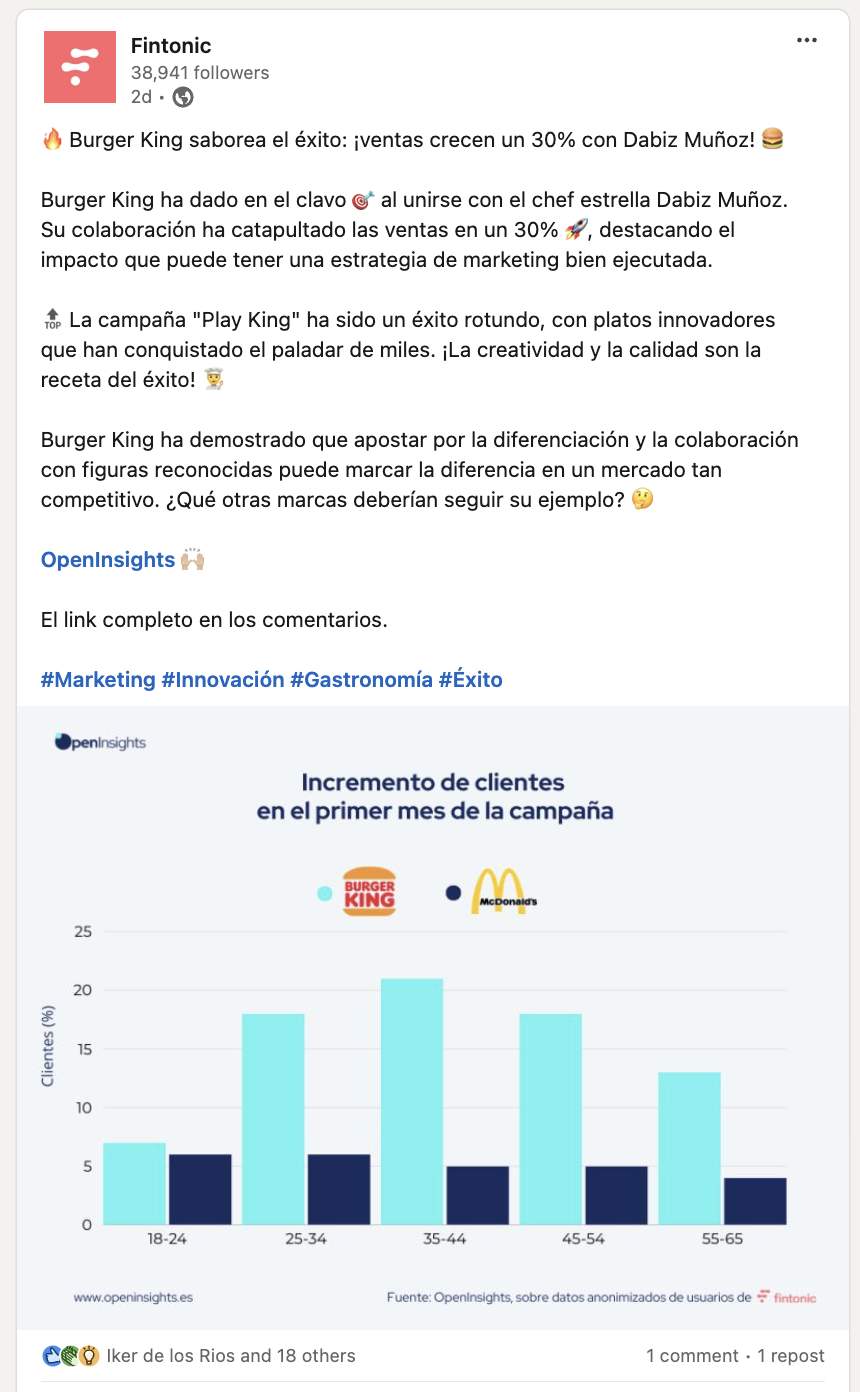 Por otro lado, LinkedIn es una plataforma donde el contenido profesional y más profundo tiene mayor resonancia. Los usuarios buscan insights que puedan aplicar en su trabajo, historias de éxito empresarial y análisis detallados. Para el mismo caso de Burger King, en LinkedIn estructuramos el contenido para resaltar los aspectos estratégicos y de marketing de la campaña.