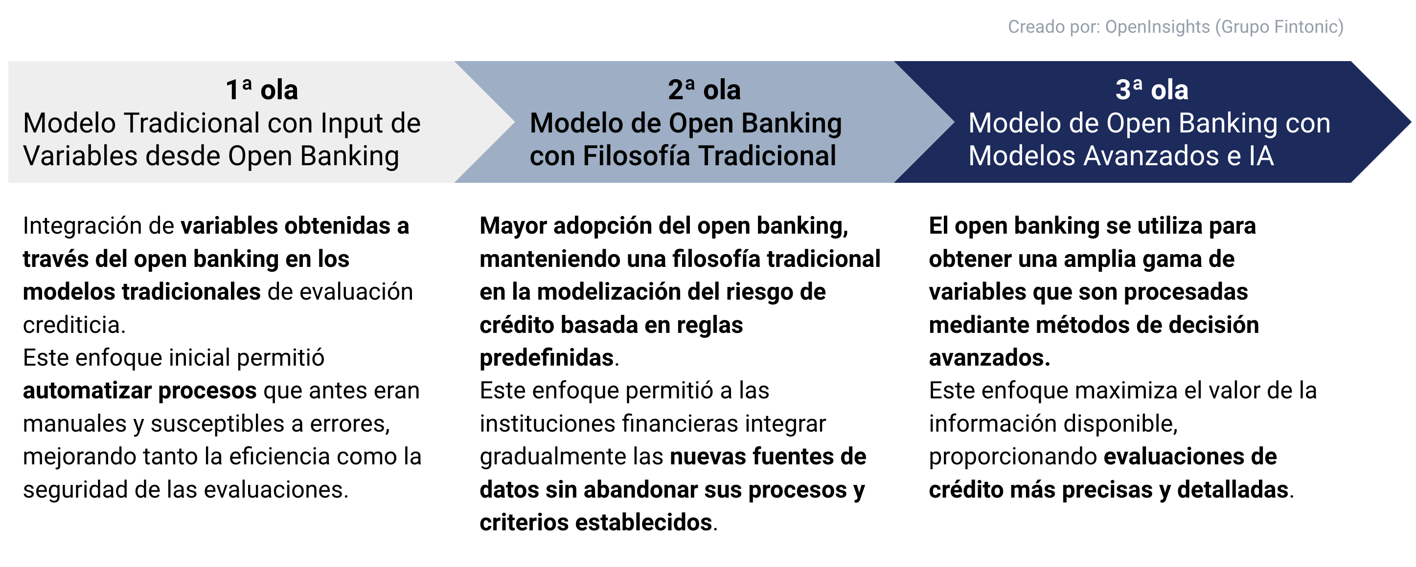 La tercera ola representa el punto culminante de esta evolución, donde el open banking se utiliza para obtener una amplia gama de variables que son procesadas mediante métodos de decisión avanzados. Este enfoque maximiza el valor de la información disponible, proporcionando evaluaciones de crédito más precisas y detalladas.