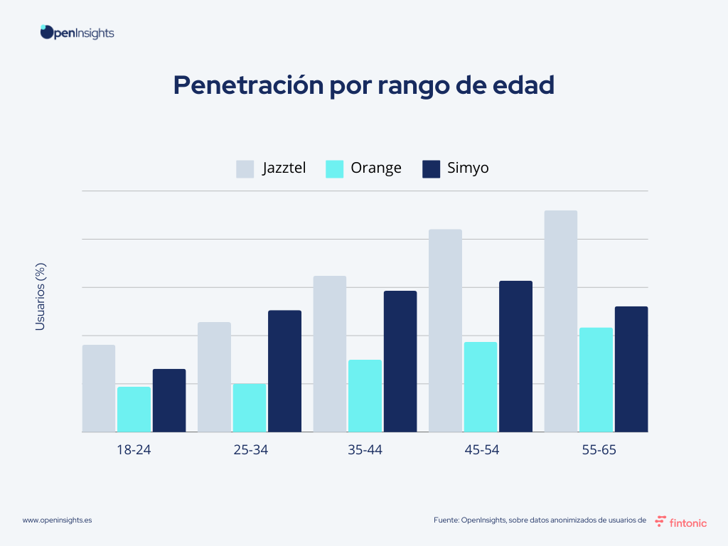 – Jazztel domina en la mayoría de los segmentos de edad, excepto en los jóvenes de 25 a 34 años, donde Simyo es más popular, reflejando su atractivo en este grupo demográfico.